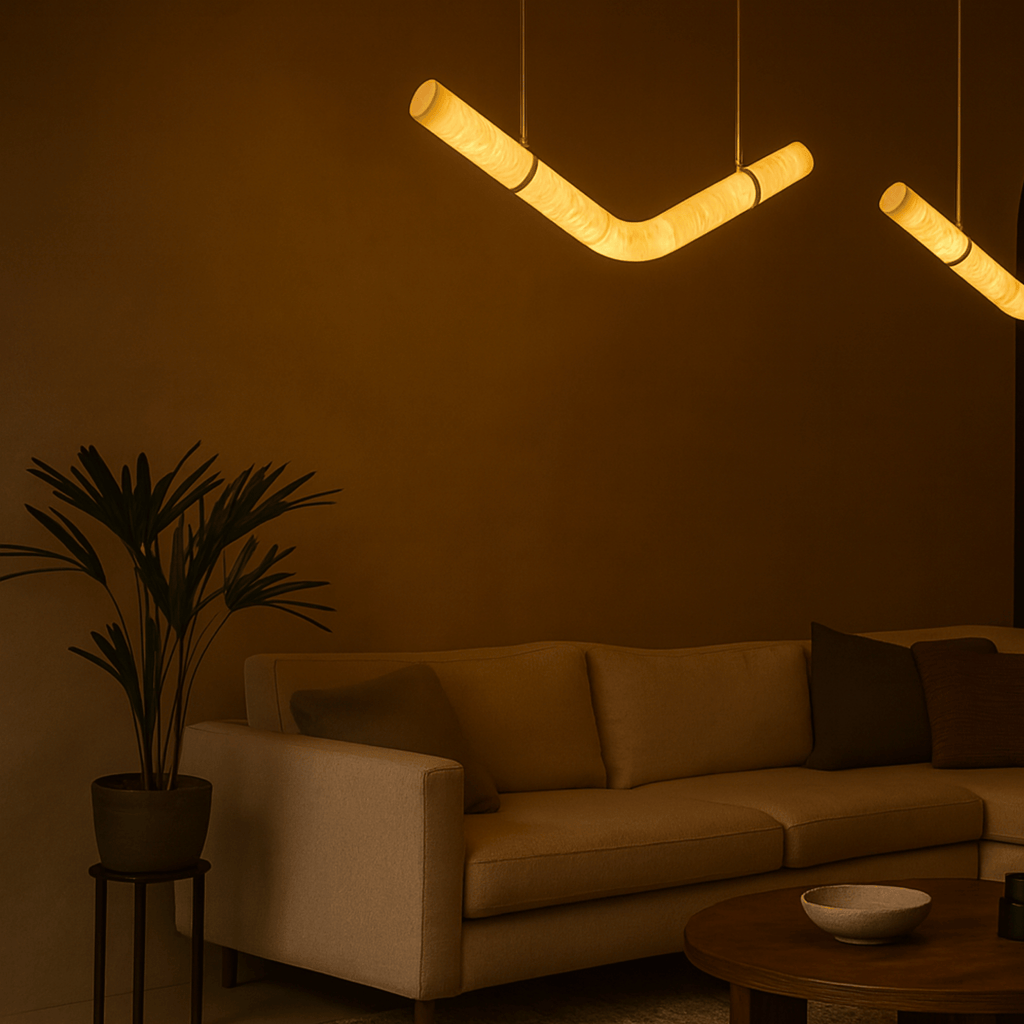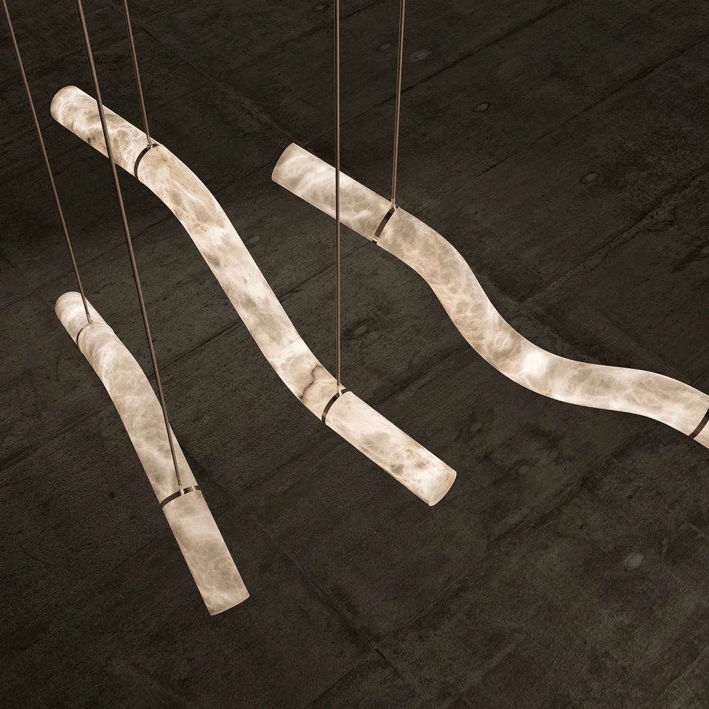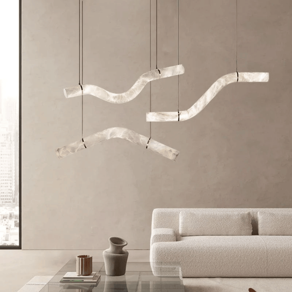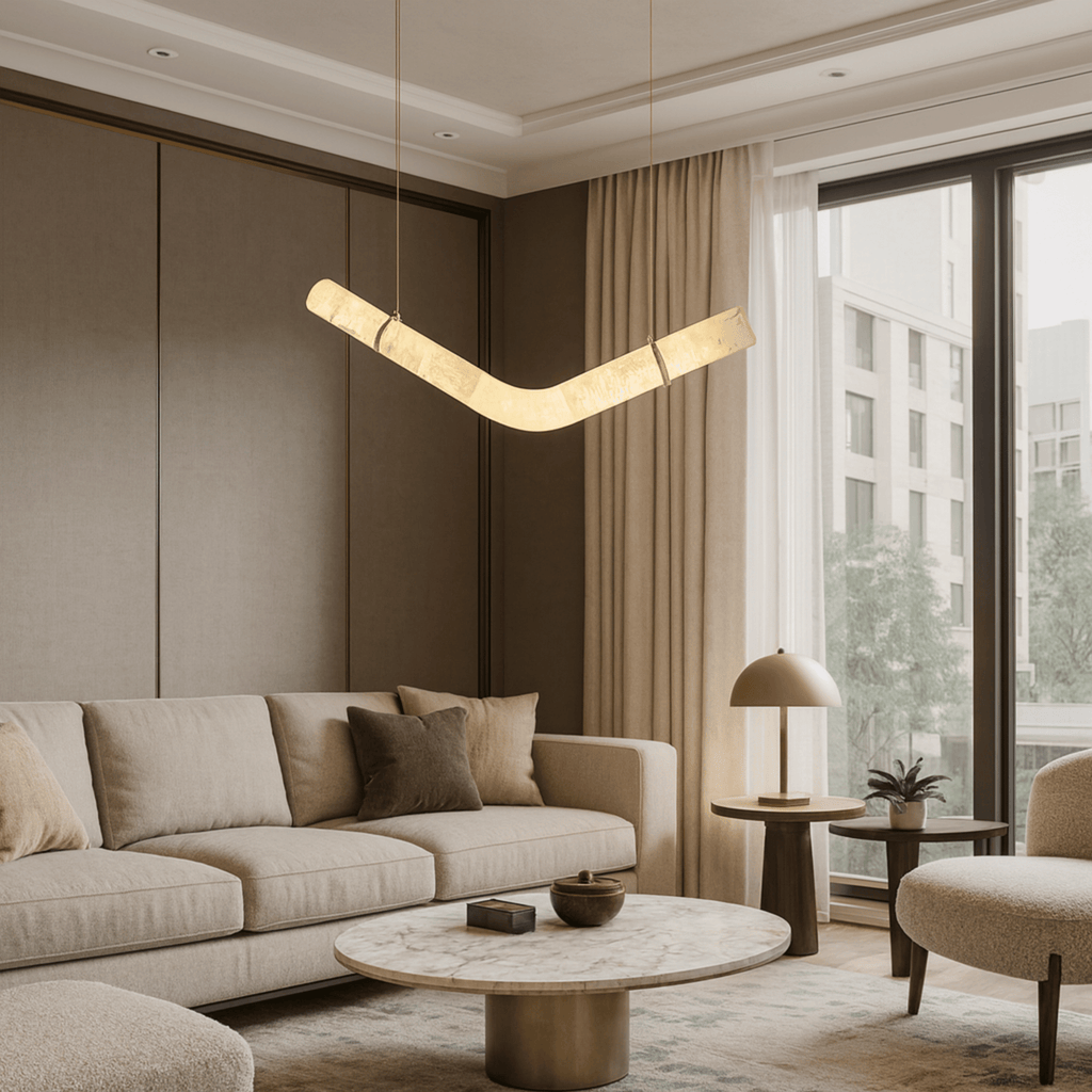 The Bogen marble arc pendant light is hand-carved from genuine marble, giving each piece a completely unique pattern of natural veining that no factory-produced fixture can replicate. Its sweeping V-curve silhouette functions as both a light source and a sculptural art piece. Combined with warm 3000K LED illumination, it transforms an ordinary ceiling into an architectural focal point that draws the eye and elevates the entire room.