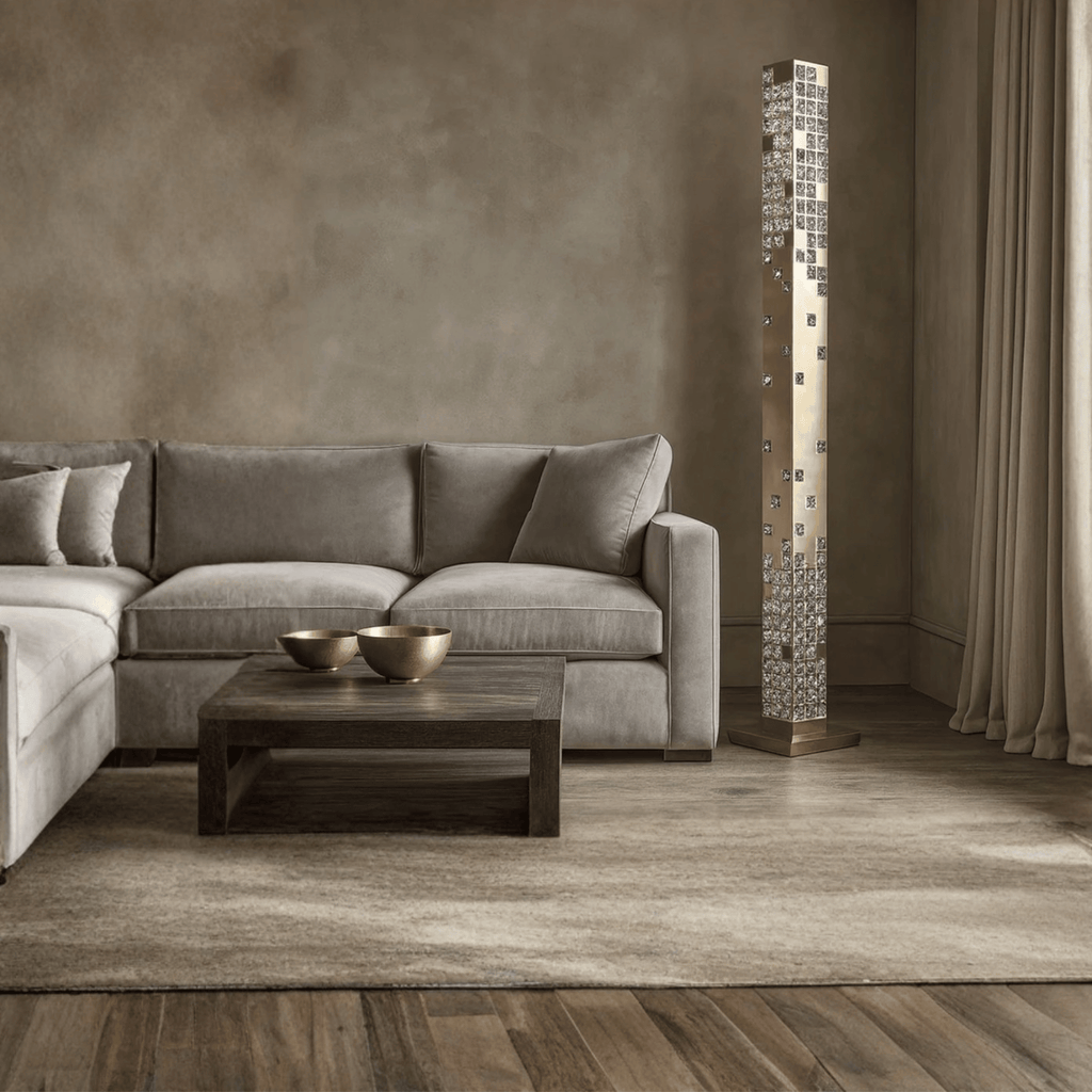 The Glodra Crystal Tower Floor Lamp combines a slim vertical silhouette standing 61 inches tall (approx. 155 cm) with hand-set faceted crystal accents and an electroplated chrome finish. The crystals refract the integrated LED light into a shimmering, prismatic glow that animates your walls and ceiling — turning functional lighting into a sculptural centerpiece that defines the entire room.