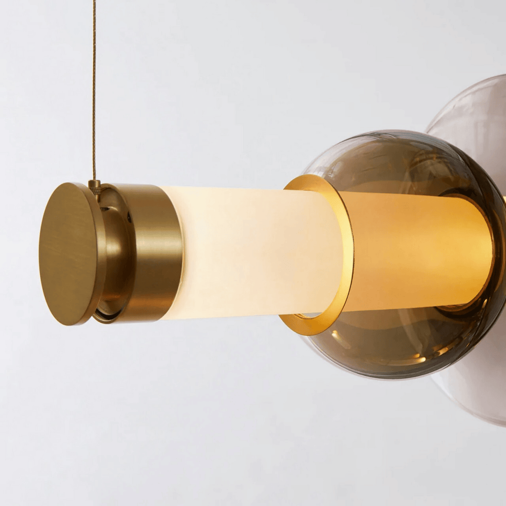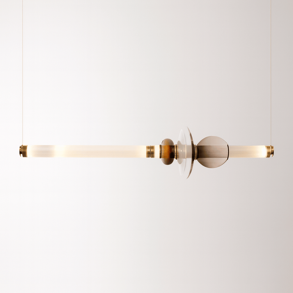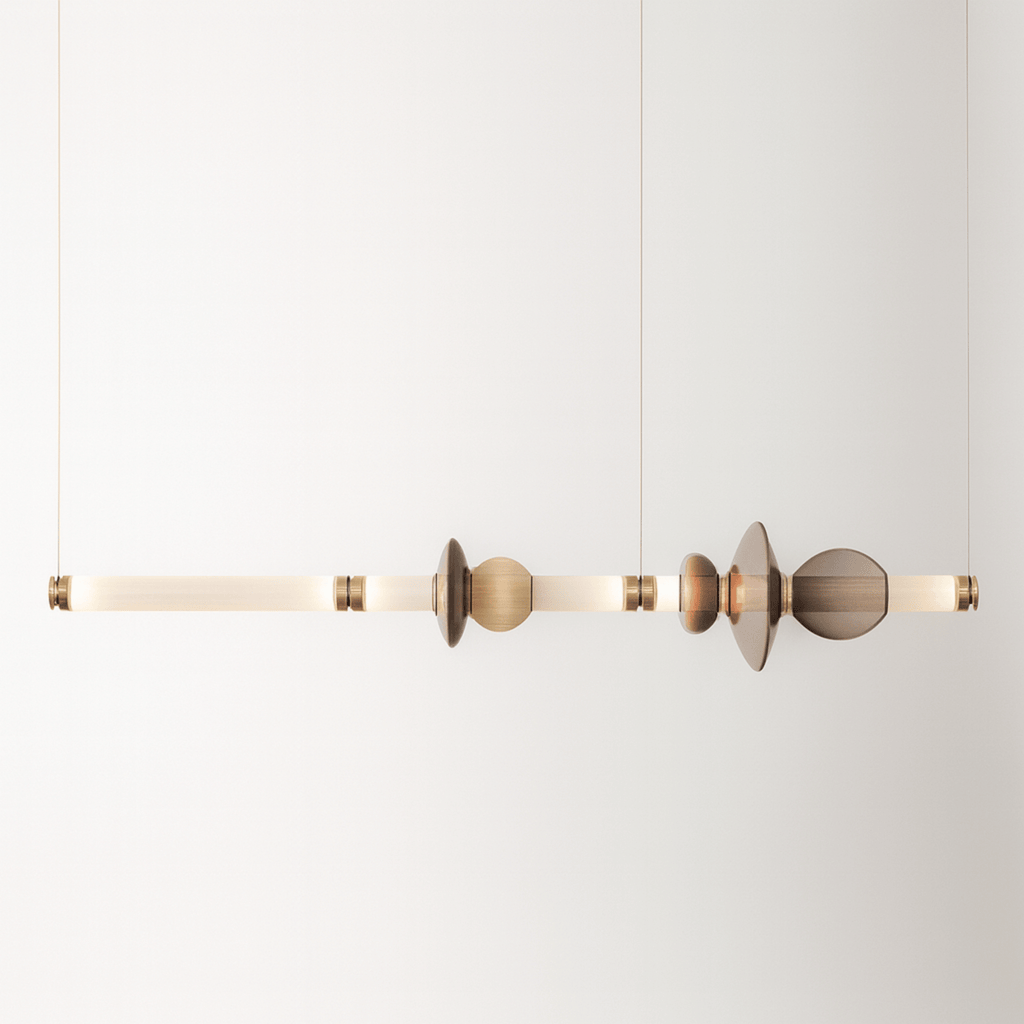 The shades are crafted from real glass combined with acrylic elements — this intentional pairing is what gives the Glodstav its distinctive light quality. The glass provides clarity and weight, while the acrylic diffuses light softly without hotspots. The metal bar and connectors are finished in a warm brass tone, adding a sense of solidity and luxury to the overall composition. All materials are selected for both aesthetics and long-term durability.