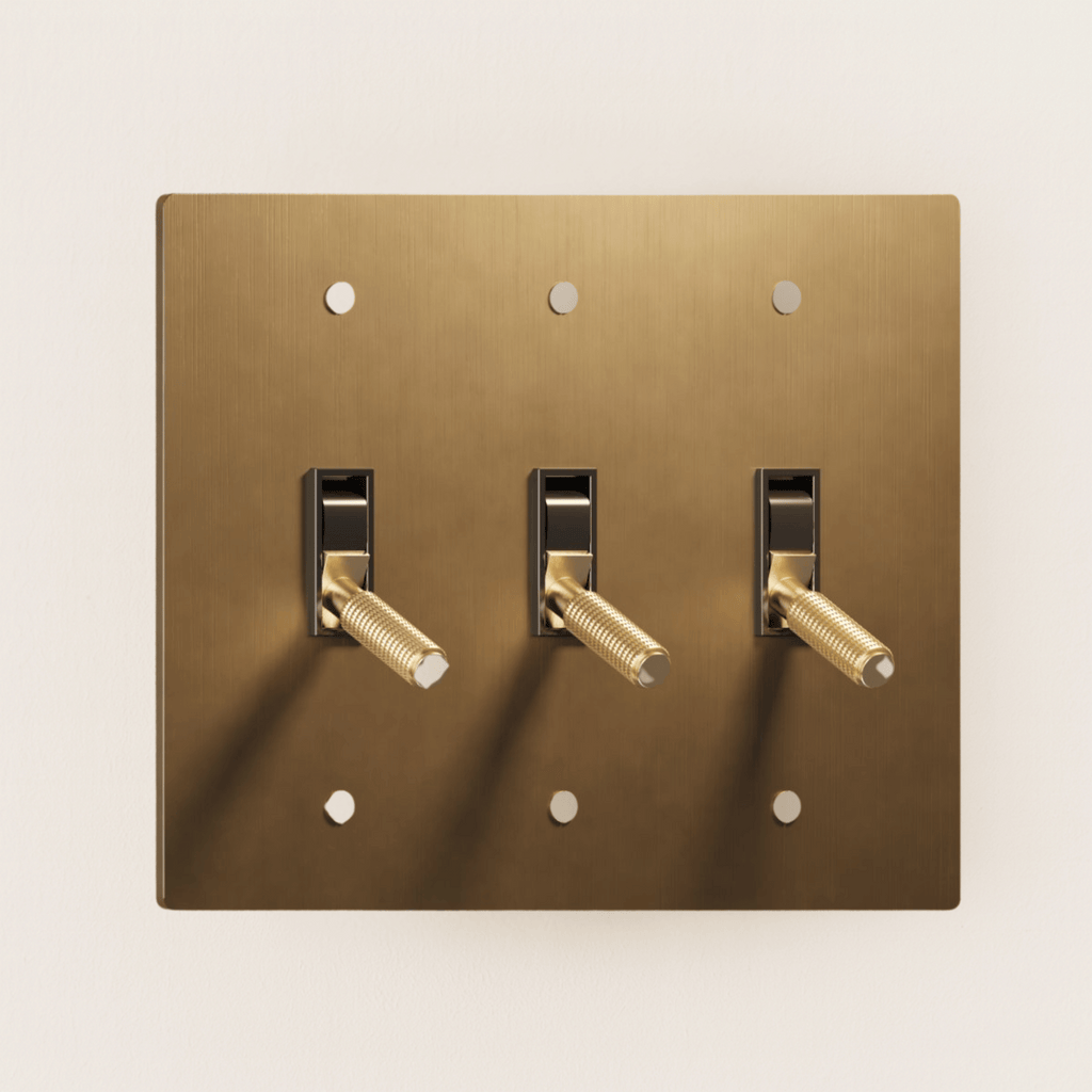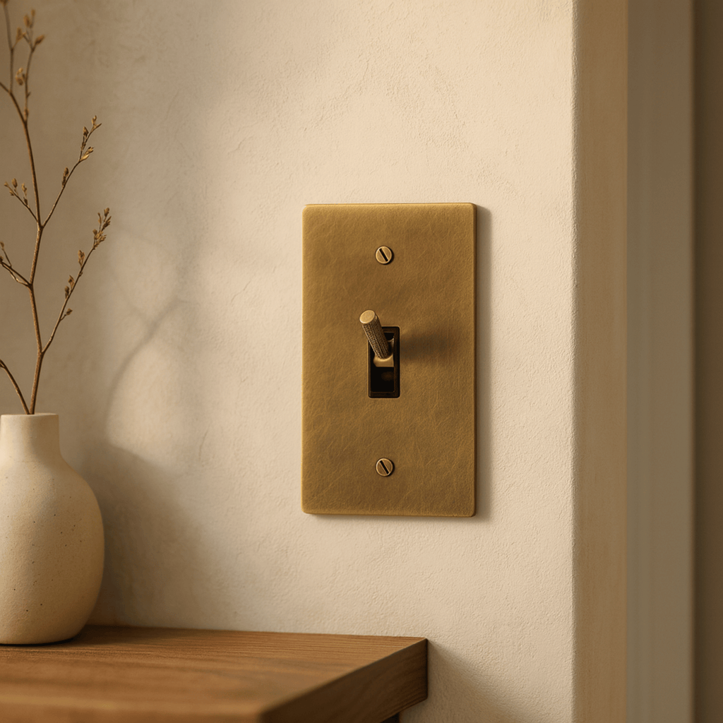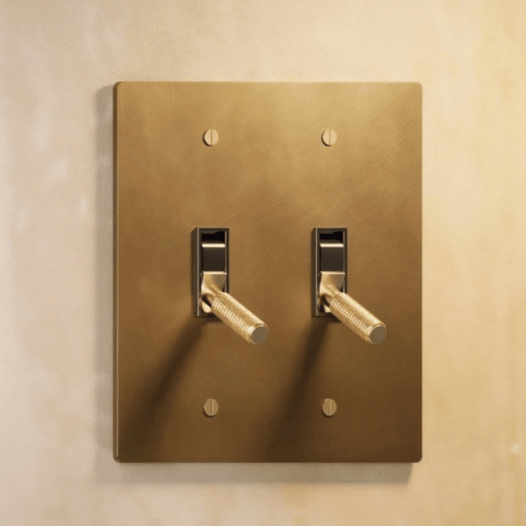 Unlike a standard plastic switch, the Knappa Brass Toggle Switch Panel is crafted from solid brass with copper inner components and a handcrafted retro gold finish. It brings genuine material warmth to a detail most people overlook. The result is a switch that feels as elevated as the rest of your interior — tactile, durable, and beautifully finished every time you touch it.