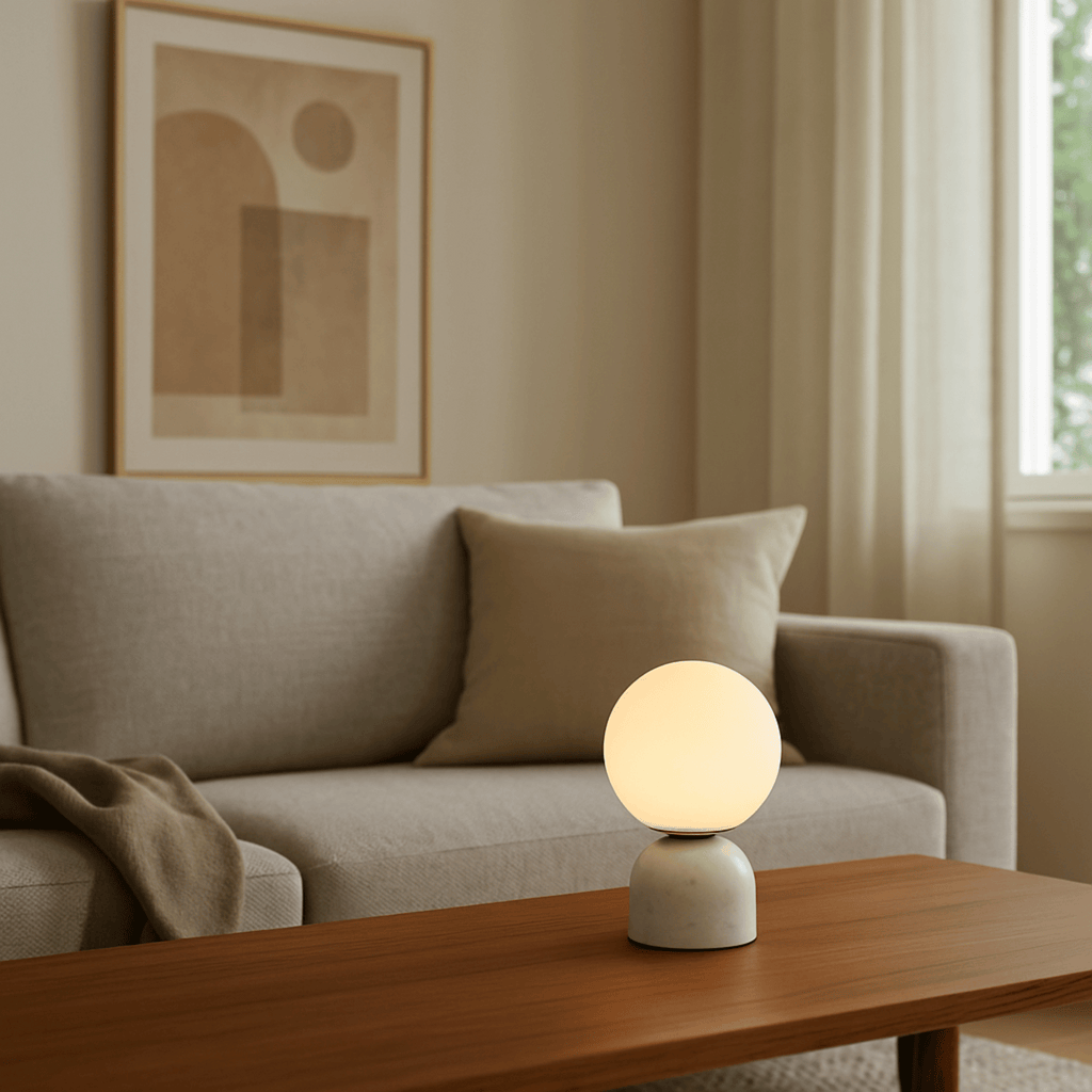 To keep your lamp looking its best, wipe the marble base with a soft, dry cloth — avoid water or liquid cleaners, as moisture can dull or stain natural marble over time. The frosted glass globe can be gently dusted with a dry or lightly damp cloth when the lamp is off and cool. Store or move it carefully by holding the base rather than the globe to protect the connection between the two materials.