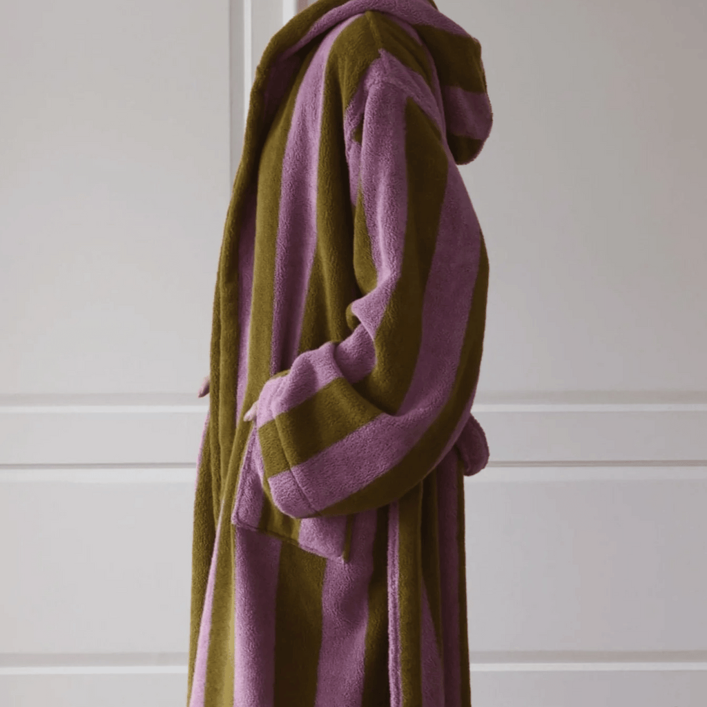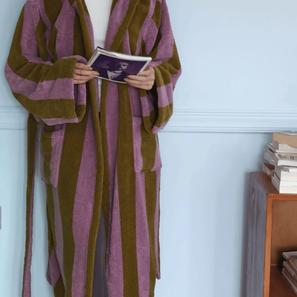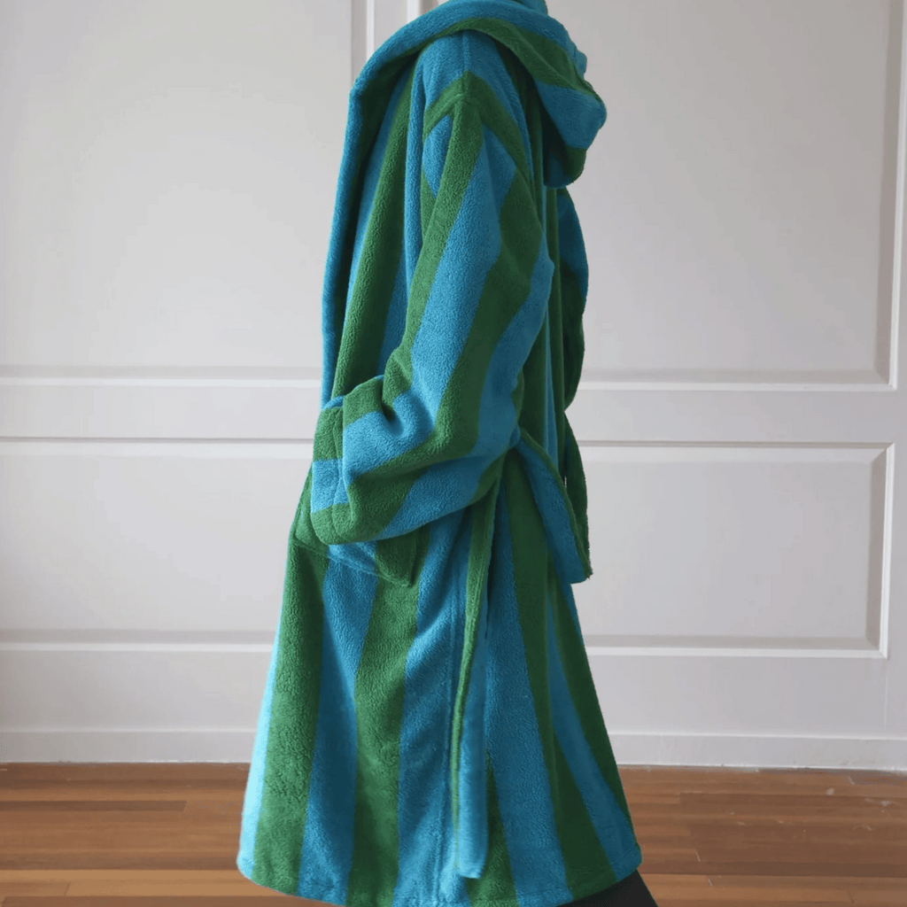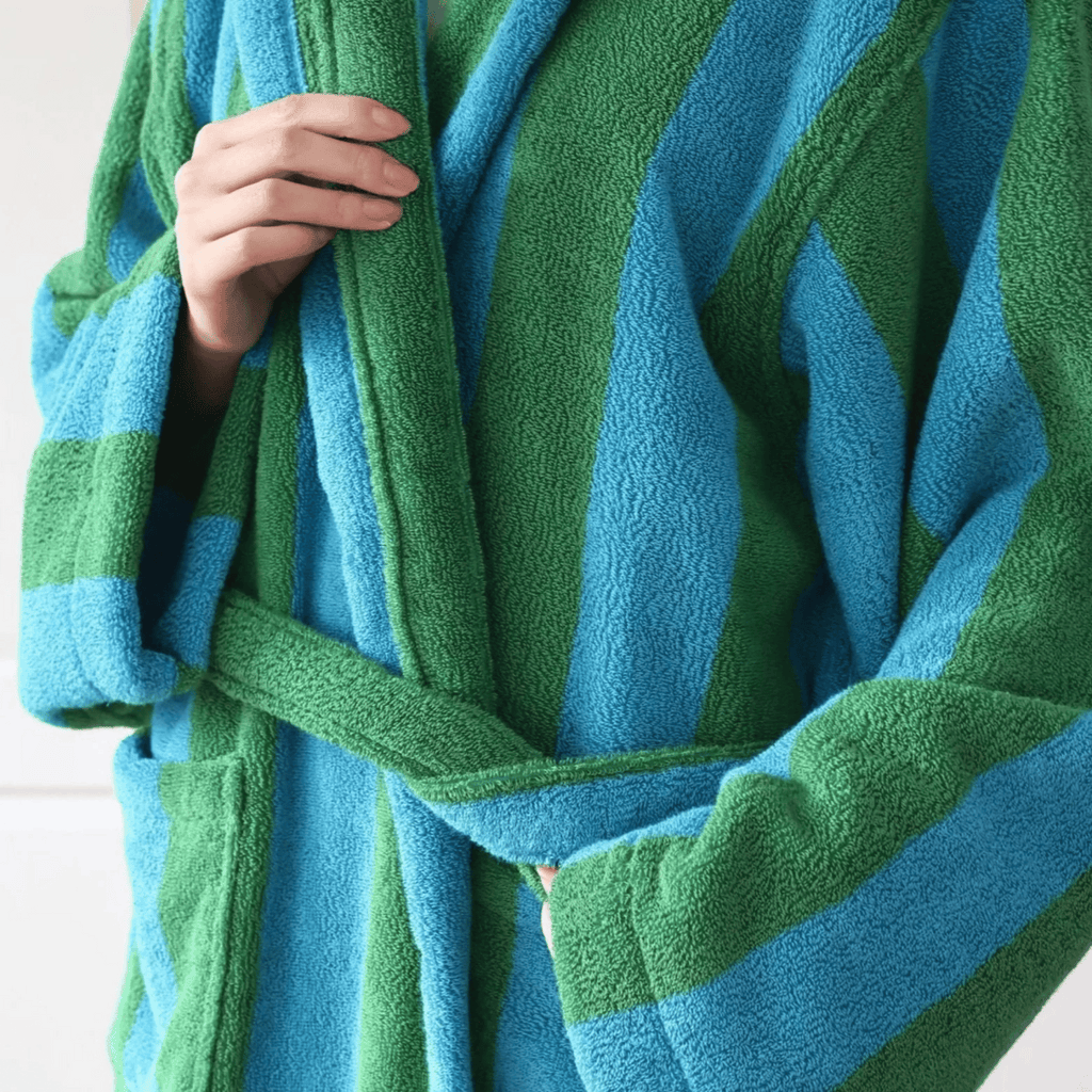 The bold stripe design is woven directly into the fabric using a yarn-dyed jacquard technique — not printed or applied on top. This means the color is embedded in every individual thread, so the pattern will never fade, crack, or peel over time. You get a robe that looks just as sharp after fifty washes as it did on day one.