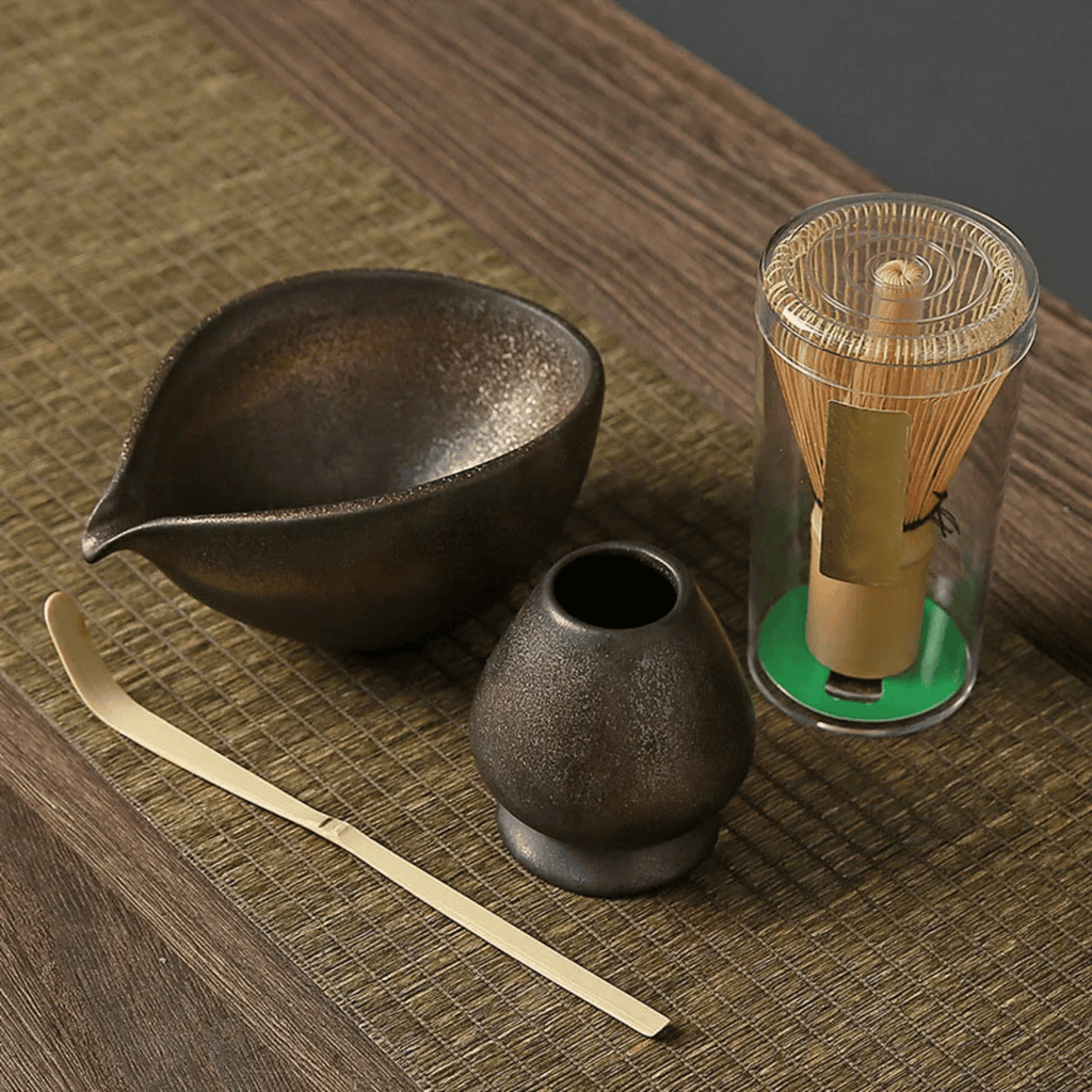Absolutely. The bowl is crafted from high-quality glazed ceramic, finished with a rustic texture that gives each piece a beautifully individual character. The whisk and spoon are made from natural bamboo — a sustainably sourced material prized in traditional tea craft for its flexibility, lightness, and durability. No synthetic coatings or artificial finishes are used on the bamboo components, keeping your matcha preparation clean and natural.